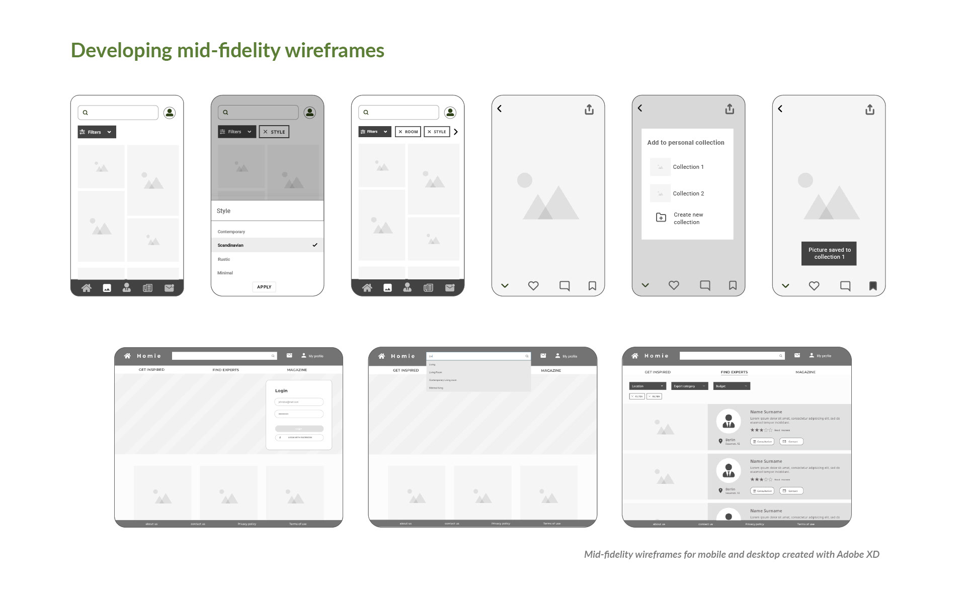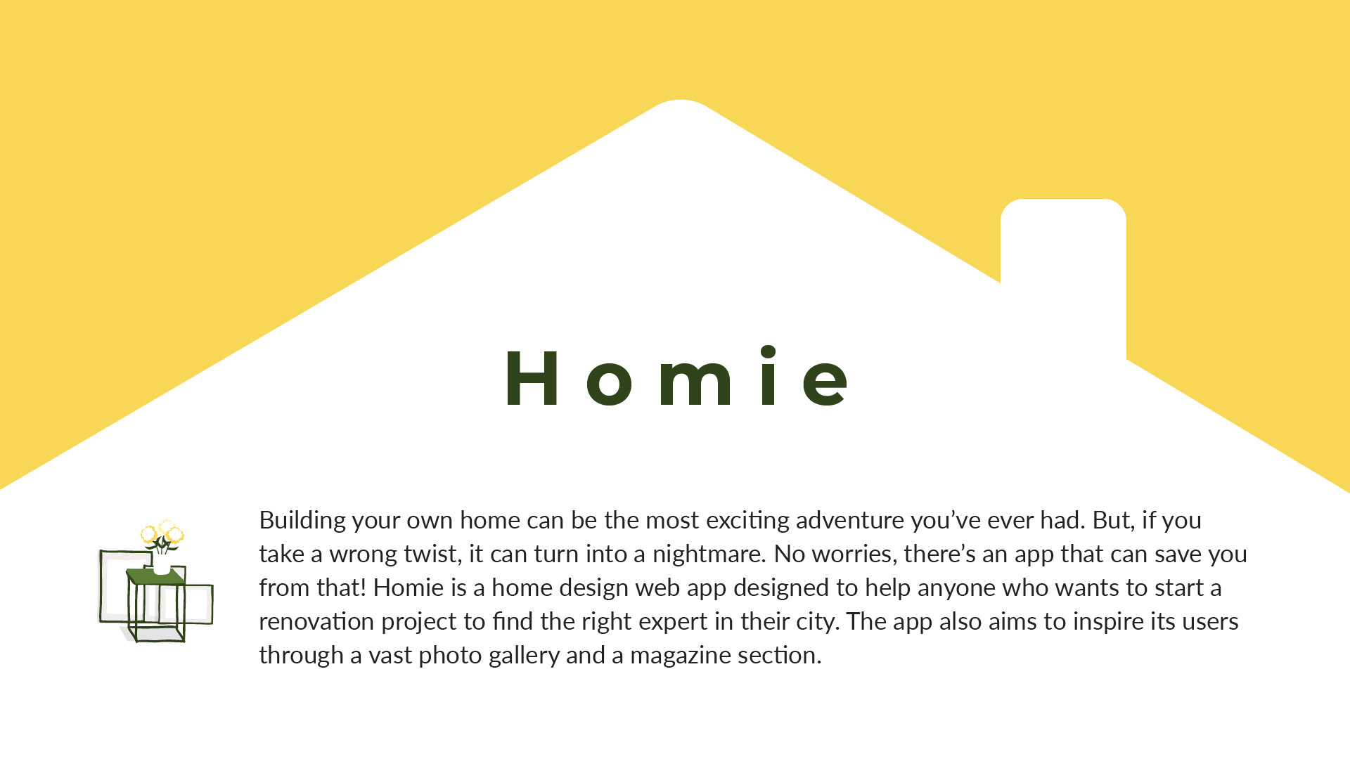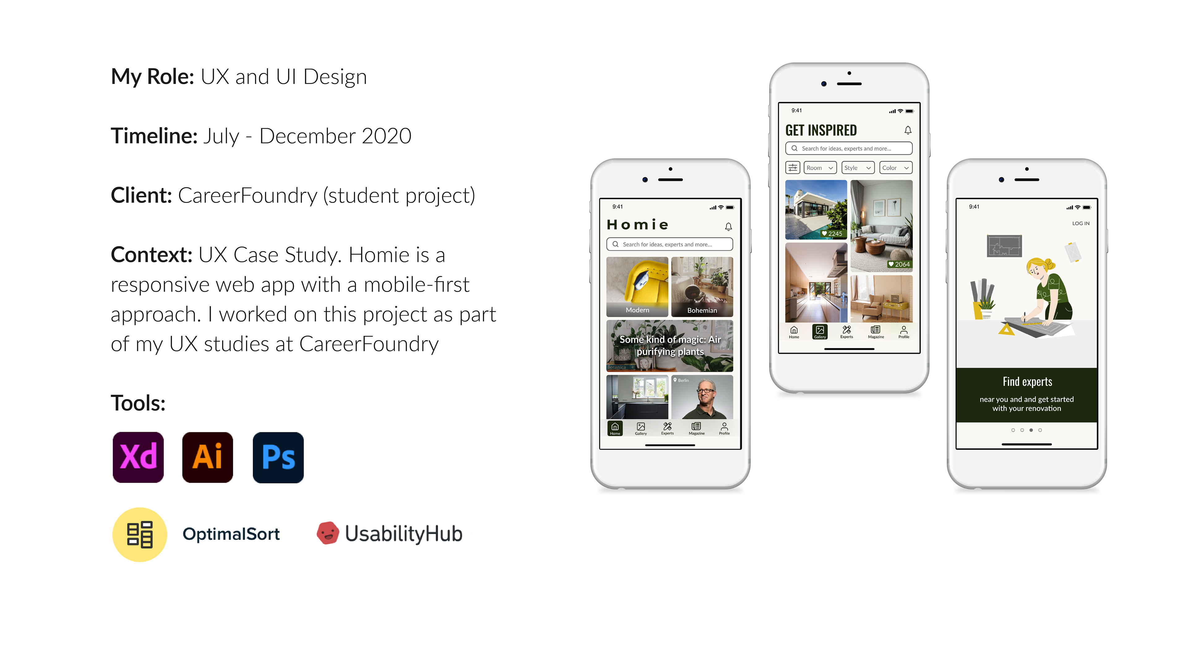 UX Design case study. Homie is a home design web app created to help anyone who wants to start a a renovation to find the right expert in their city. The app also aims to inspire its users through a vast photo gallery and a magazine section.
